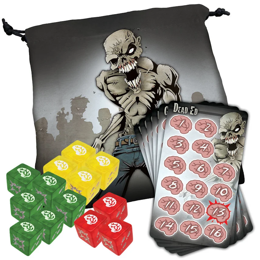 First released in May 2010, Zombie Dice has continuously been one of our top sellers. To mark this anniversary, we are releasing Zombie Dice Deluxe! This new boxed set features new 16mm translucent dice in three different colors (6 green, 4 yellow, 3 red), as well as a dice bag with a screen printing of our brain-hungry Zombie. Also included are six tarot-sized dry-erase scorecards and a dry-erase marker, making this set completely playable right out of the box!