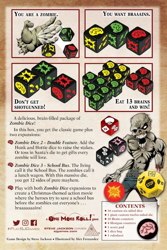 It's Zombie Dice and two expansions – in one delicious, brain-filled package!